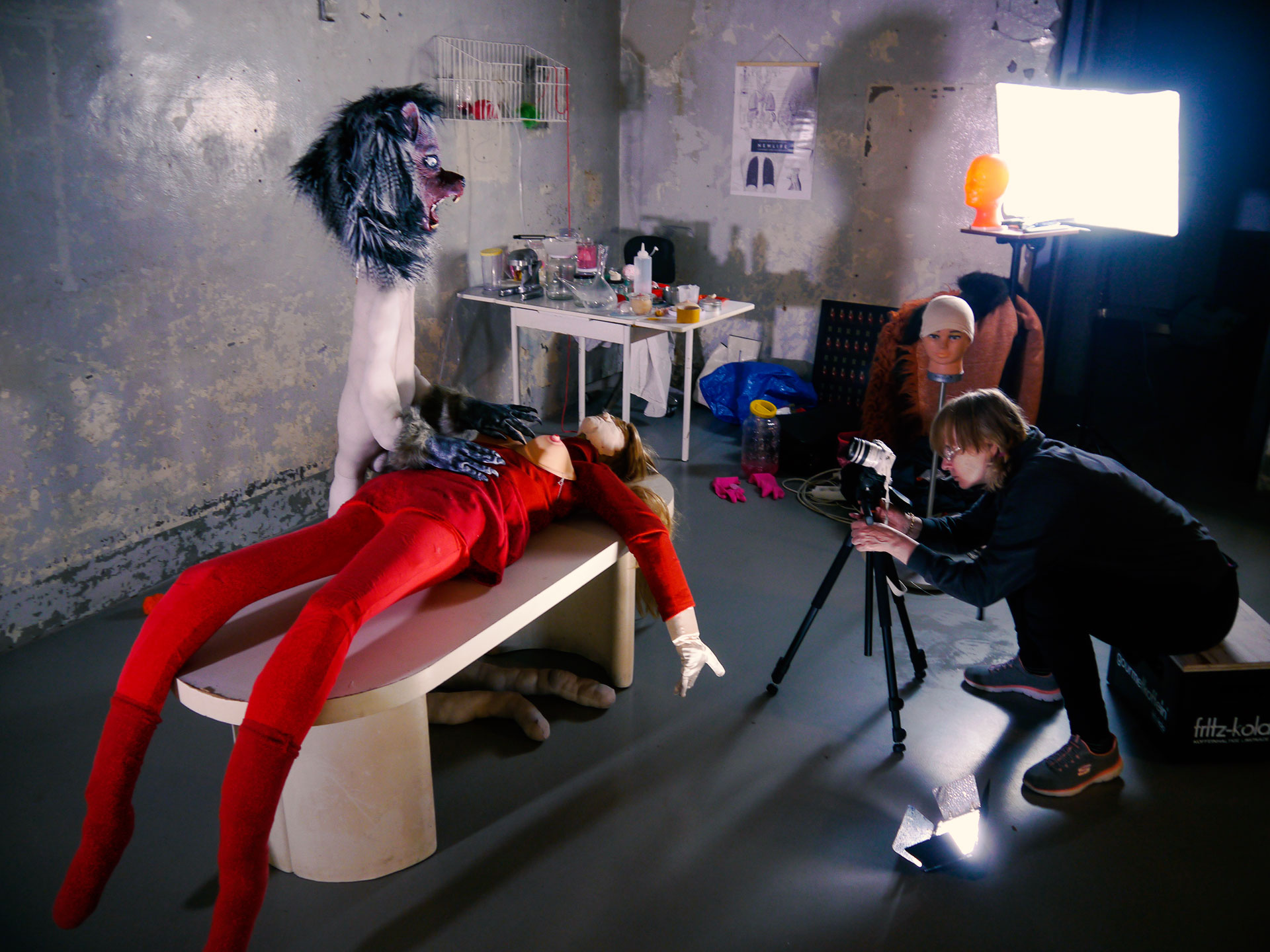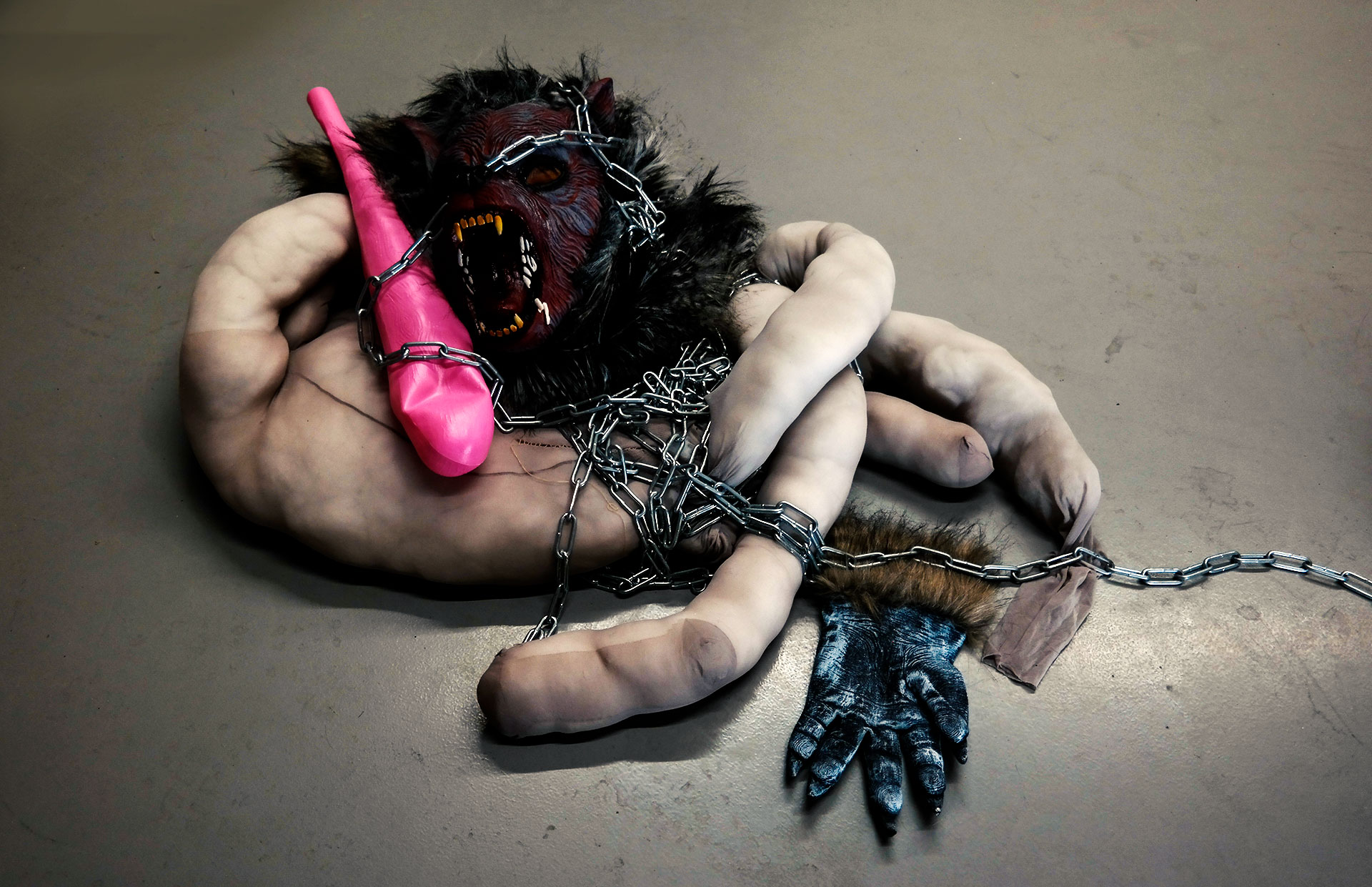 DURGA MAA (indische Göttin, große Mutter) wird oft auf einem Tiger reitend dargestellt, sie hat mit den ihr von den Göttern verliehenen Waffen den Büffeldämon Mahisasur besiegt. Die Figur des bösen Wolfes symbolisiert in dem neuen Projekt der Künstlerin die Übergriffigkeit des Krebses. .